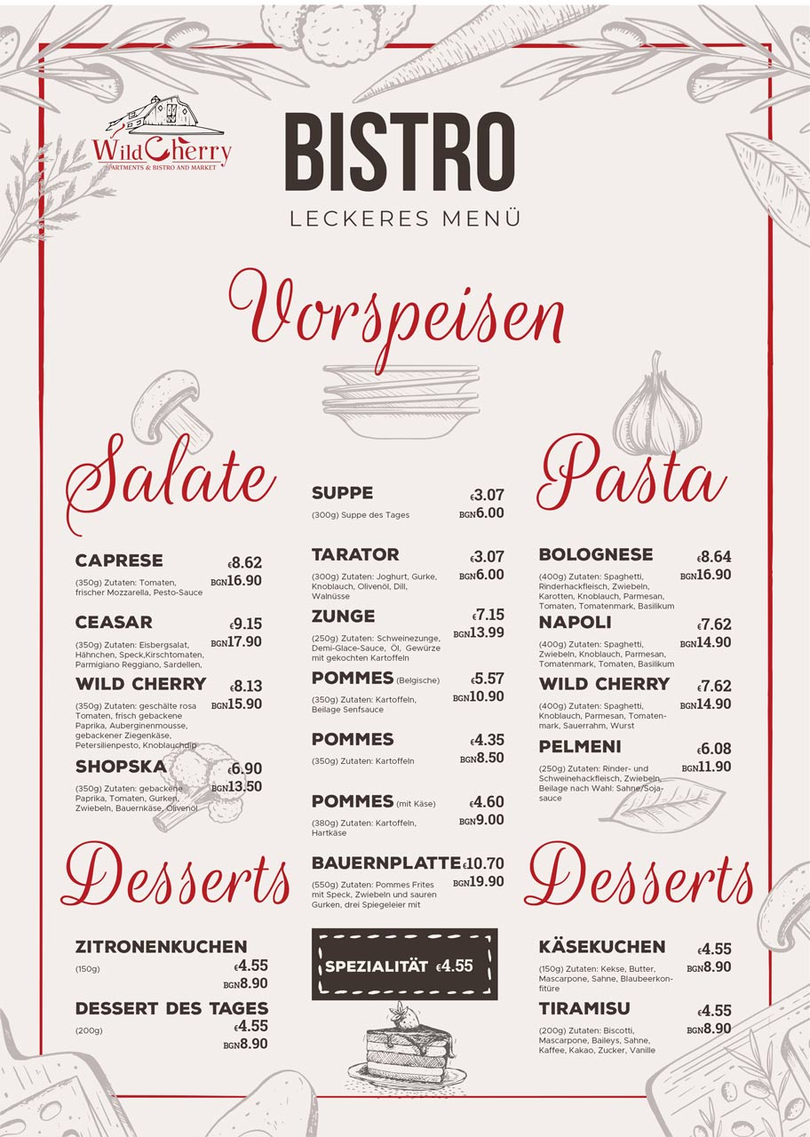 Mahlzeiten mit Vorbestellung verfügbar: Frühstück (15 BGN), Mittagessen (20 BGN), Abendessen (25 BGN)